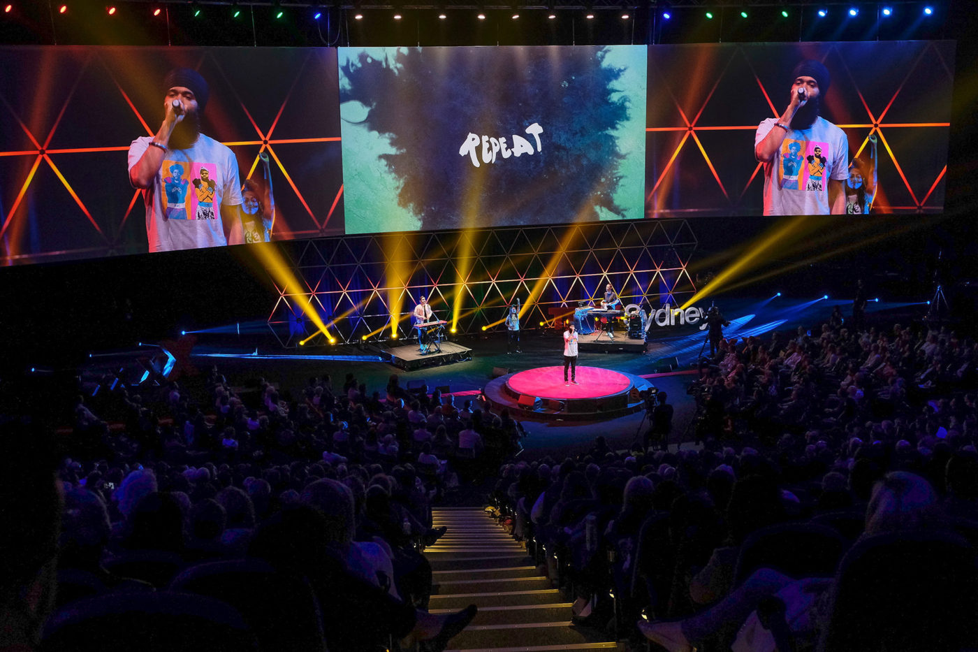 This started in the ICC Theatre whith a bold production design that abandoned a traditional stage in favour of activating the floor area to maximise sight lines and maintain the intimate connection between audience and speakers. The technical production team oversaw an epic schedule with 15 presenters and 8 entertainment acts across 4 sessions requiring quick changeovers and the seamless integration of a broadcast component streaming to over 500000 viewers across the globe.