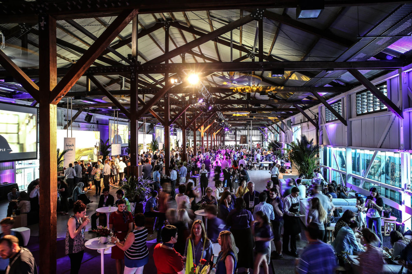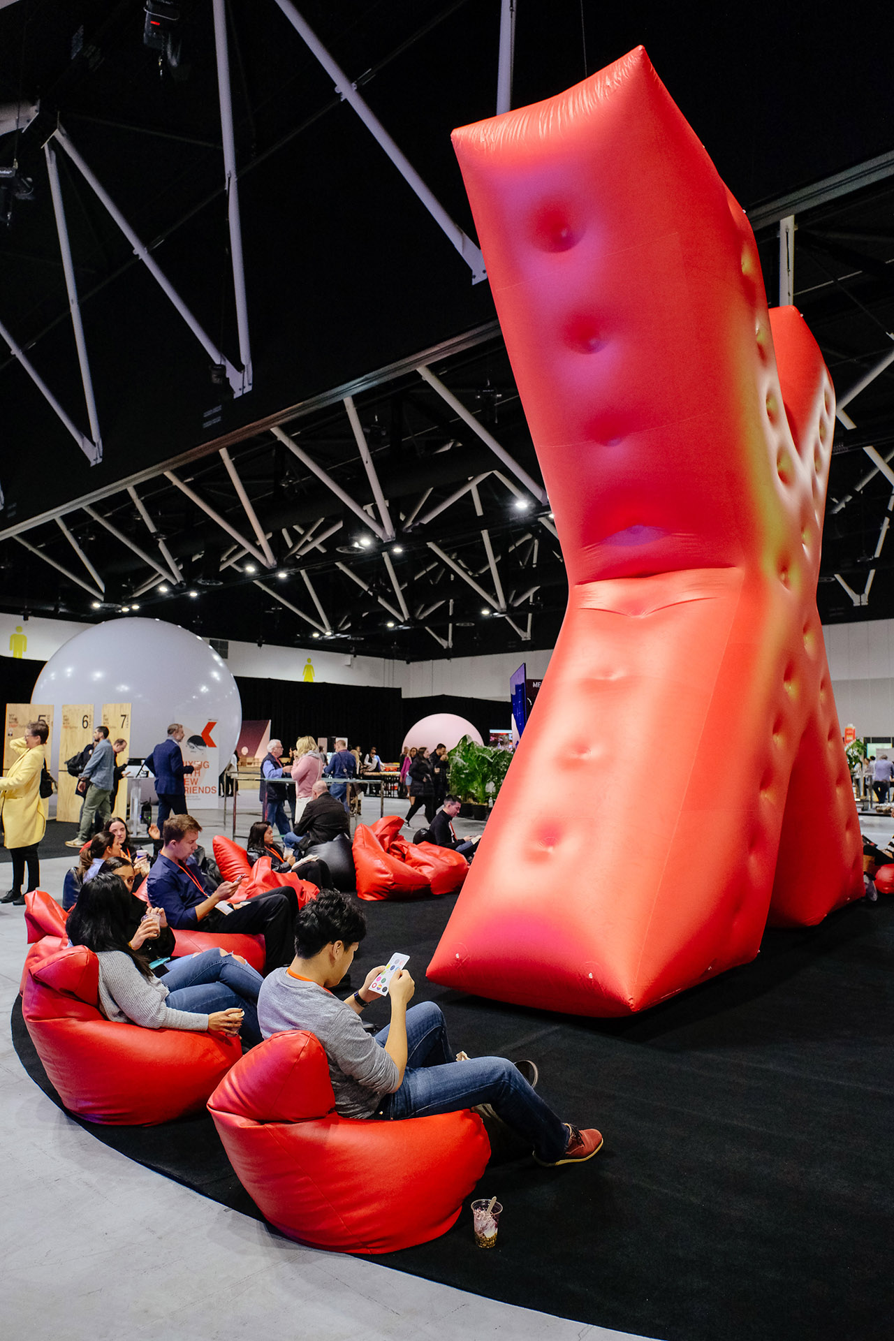BLE also oversaw a new innovation that has redefined what happens outside of the TEDx Theatre. The TEDx Hub is a multi-function precinct where participants and stakeholders can interact across the day. BLE activated 9000m2 of exhibition space to accommodate registration zones, food and beverage service for 4500 people, partner and donor lounges, a satellite stage and a collection of engaging activities inspired by the core principles of TED. The Hub was organized around 15 giant inflatable spheres suspended above circular carpeted zones, each colour coded to match the 15 ‘TEDx Tribes’, each representing a hot topic like LGBQTI, Sustainability, Creativity, Technology and The Future. Conceived as places where like-minded people could connect, each space also hosted a unique experience ranging from ‘Silent Disco Tai-Chi’ to art installations and interactive music technologies.