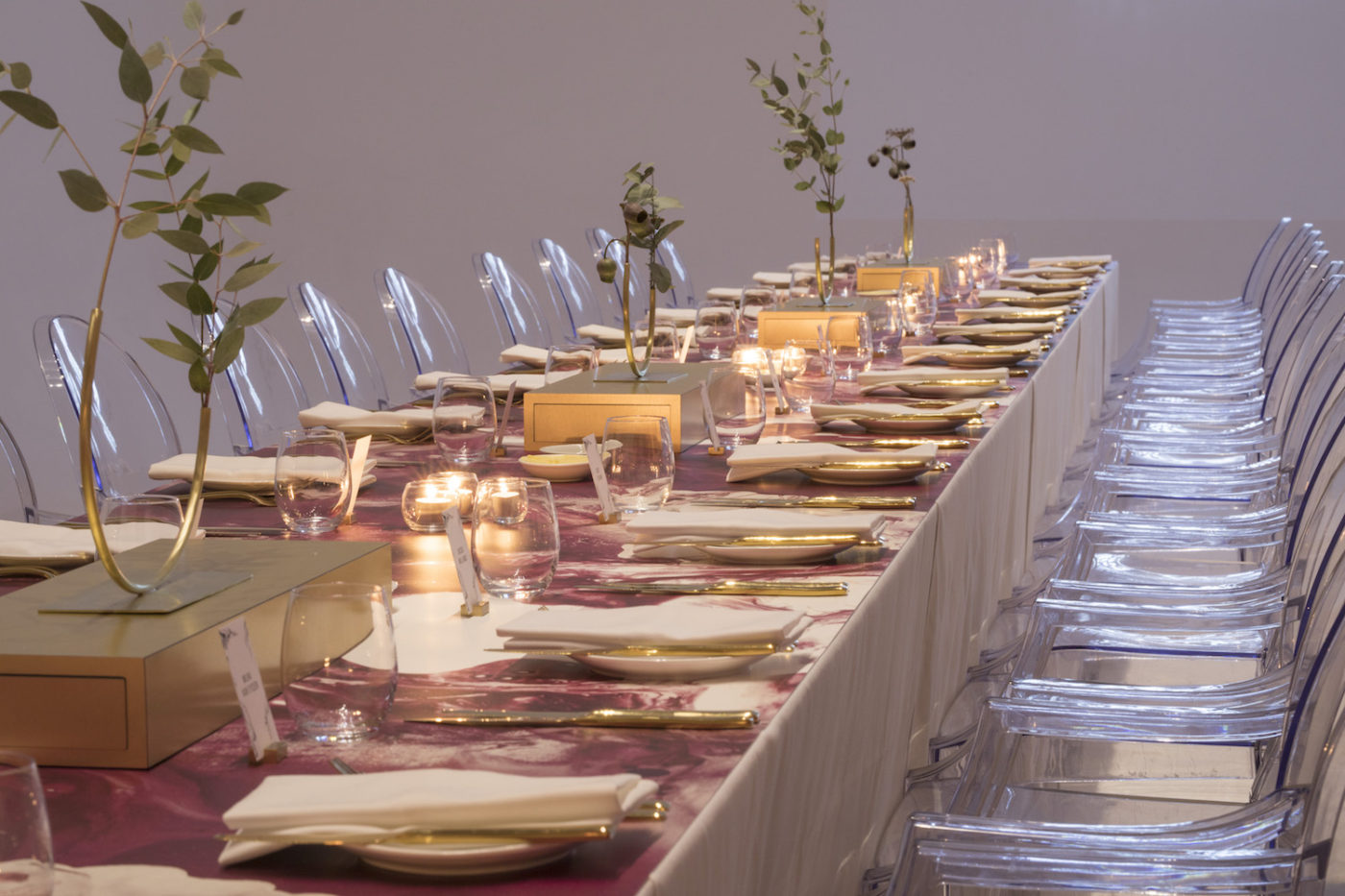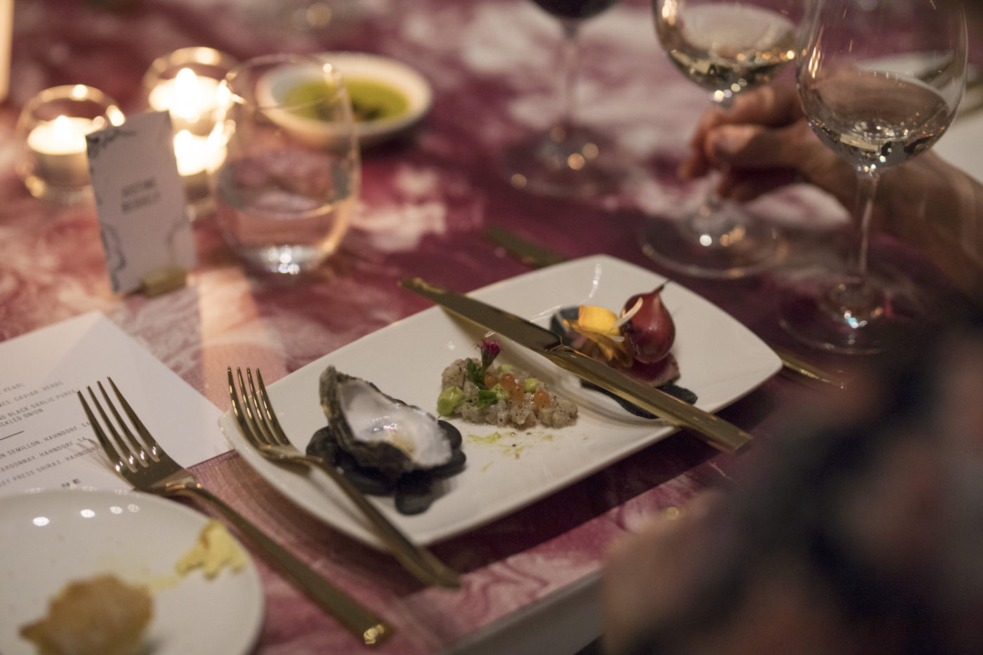 A pre-dinner area engaged the senses with wine scent experiences, custom animations and delightful canapés. A dining room reveal introduced a space centred around two long tables with striking printed table tops, bespoke brass detailing and custom vases with sculptural native floral. Here guests were treated to a series of matched food and wine experiences including a blind tasting with black glassware, theatrical dessert reveal and a 100 year old tawny port served along with chocolate truffles hidden in secret compartments on the table. Each course and associated winery was introduced by a show-reel including custom animation and motion design commissioned by BLE.