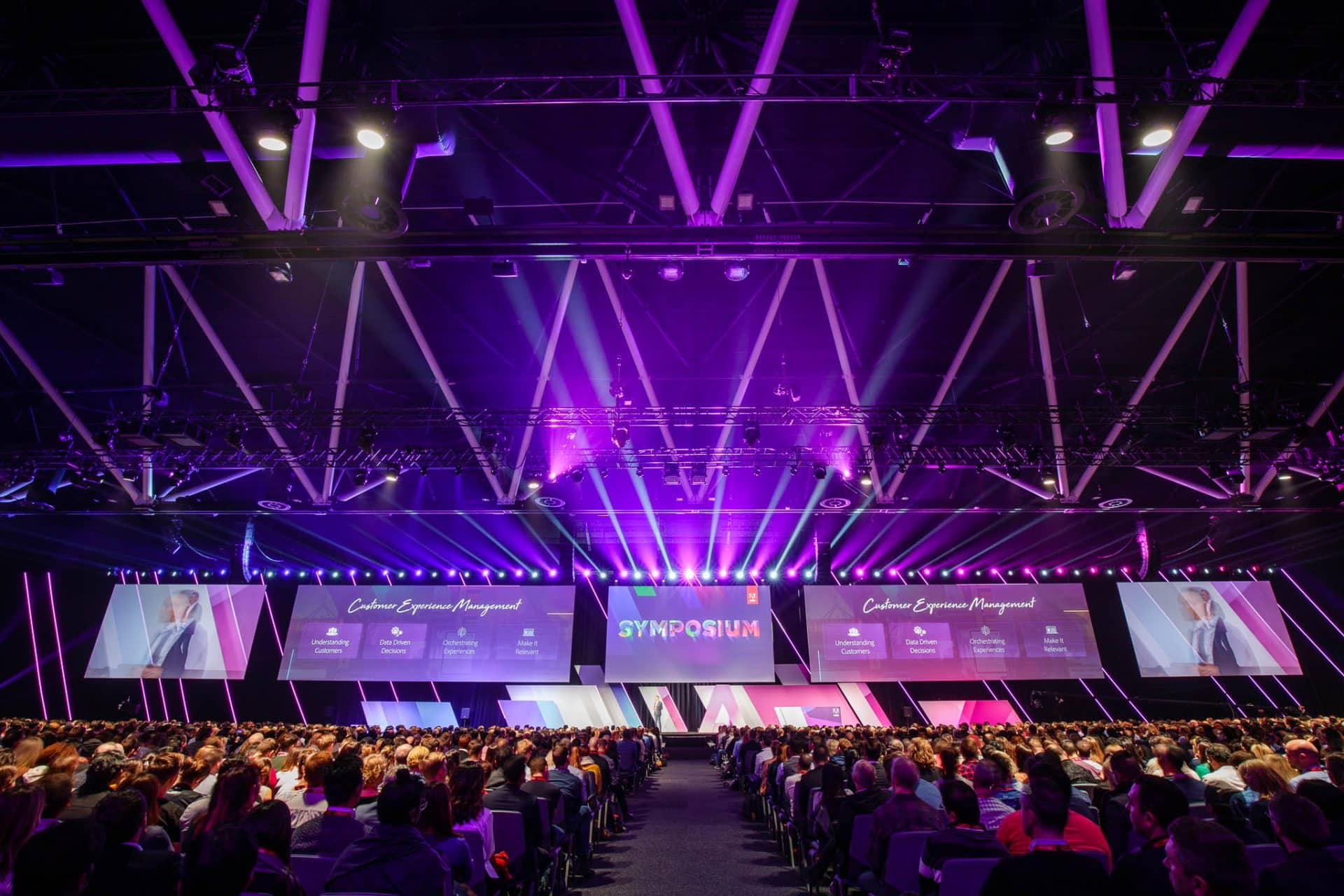 A 3,500-person main stage was constructed from the ground up within the ICC - housing keynote moments, live-stream broadcasts, and Adobe’s custom-branded content set.